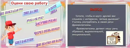 - Вы сегодня хорошо поработали, попробуйте оценить свою работу с помощью фразеологизмов.