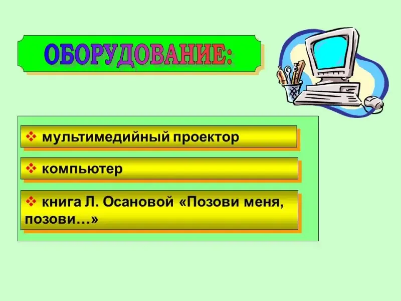 Оборудование: мультимедийный проектор, компьютер, мультимедийная презентация, книга Л.Осановой «Позови меня, позови…».
