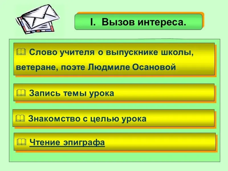 Этот человек - выпускник нашей школы, ветеран войны, Людмила Михайловна Осанова. Ученики нашего класса провели исследовательскую работу, изучая документы школьного музея, и подготовили материал о жизни Осановой. На уроке прозвучат стихи ветерана войны. Эпиграфом урока станут строчки из ее стихотворения: «Память не угаснет никогда…»