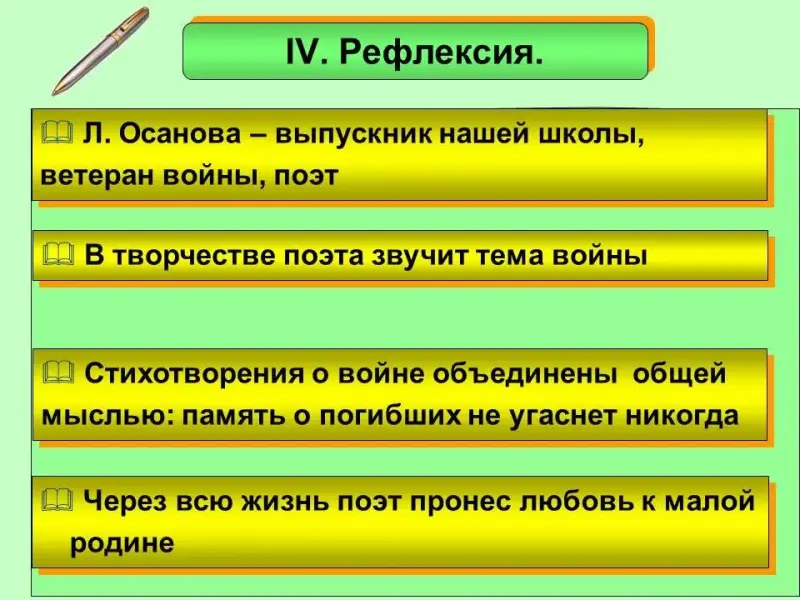 - На уроке прозвучали стихотворения Осановой о войне, которые объединяет общая мысль: память о погибших не угаснет никогда.