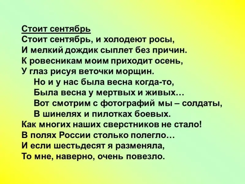 - Какие художественные средства использует автор? (олицетворение «стоит сентябрь», «холодеют росы», «приходит осень» и метафору «веточки морщин»).