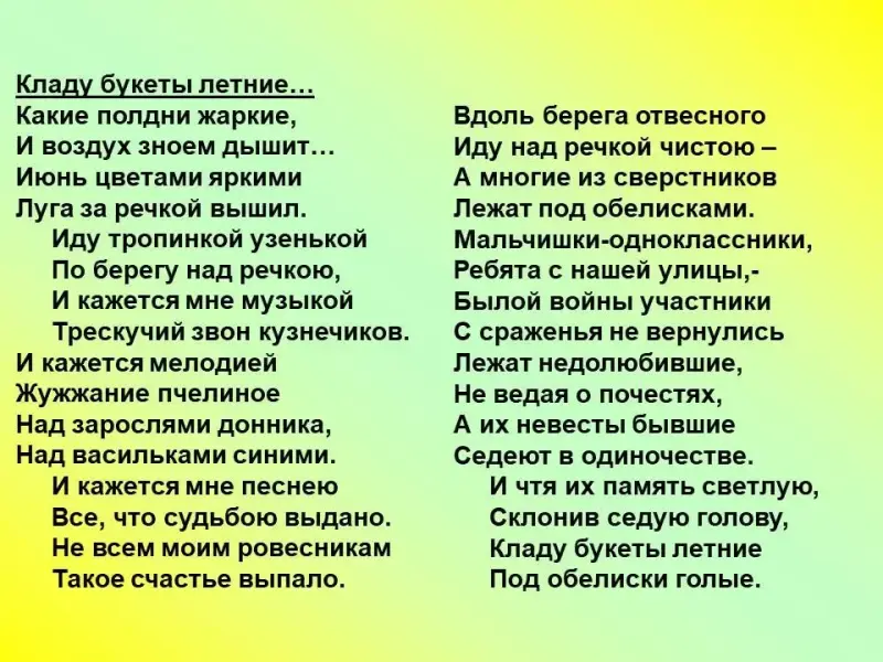 - Что хотел сказать нам поэт, какова основная мысль произведения? (память не угаснет никогда о погибших на войне).