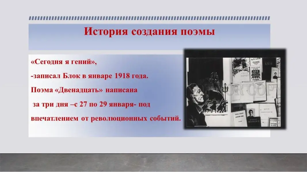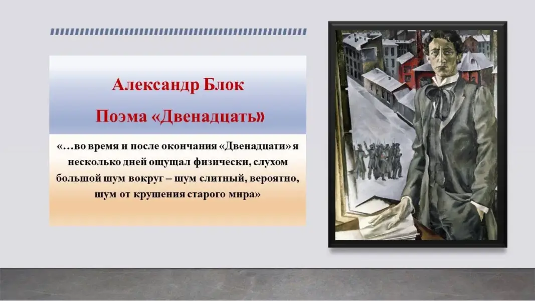 2 слайд. Под впечатлением от революционных событий Александр Блок пишет поэму «Двенадцать», которая стала итогом раздумий поэта о революции.
