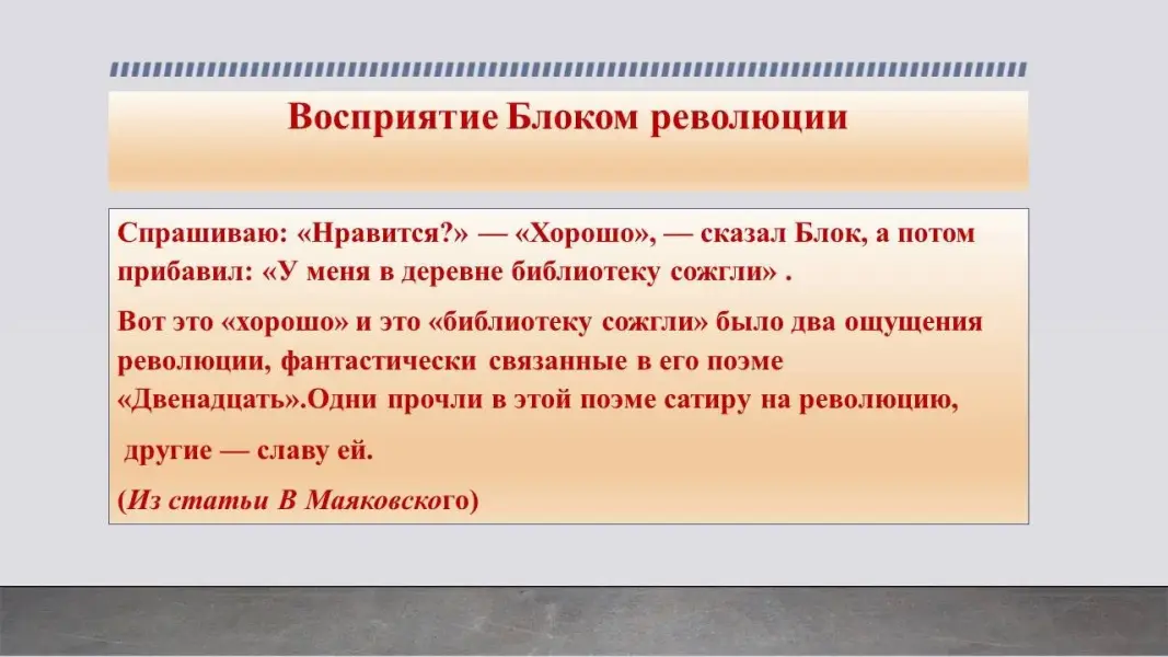 4 слайд. Двойственное отношение к революции Блока: разрушение старого мира- свобода «без креста» - видно в следующем сюжете.В статье на смерть Блока Маяковский рассказал о встрече с Блоком в революционном Петрограде: «Помню, в первые дни революции проходил я мимо худой, согнутой солдатской фигуры, греющейся у разложенного перед Зимним костра. Меня окликнули. Это был Блок. Мы дошли до Детского подъезда. Спрашиваю: «Нравится?» - «Хорошо», - сказал Блок, а потом прибавил: «У меня в деревне библиотеку сожгли». Вот это «хорошо» и это «библиотеку сожгли» было два ощущения революции, фантастически связанные в его поэме «Двенадцать». «Хорошо» - это путь в новую жизнь, «библиотеку сожгли» - без креста