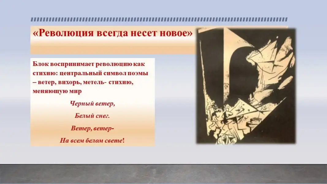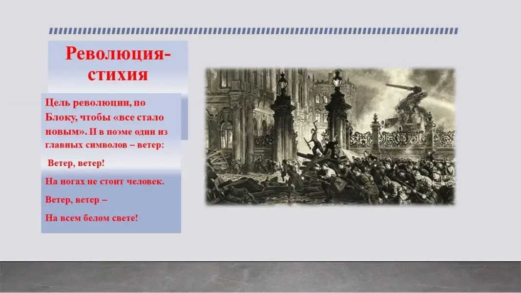 6 слайд. Блок воспринимает революцию как стихию- центральный символ поэмы - ветер, вихорь, метель: «Ветер, ветер, на всем белом свете!» Стихию, меняющую мир.). Блок воспринял революцию как очистительную силу, как стихию, разрушающую старую жизнь и в то же время созидающую новый мир. Цель революции, по Блоку, чтобы «все стало новым».