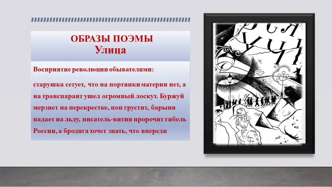 9 слайд. Блок дает восприятие революции обывателями. Мы слышим их голоса на улице революционного Петрограда: старушка, барыня, поп, буржуй - представители того уходящего старого мира. Старушка сетует, что на портянки материи нет, а на транспарант ушел огромный лоскут. Буржуй мерзнет на перекрестке, поп грустит, барыня падает на льду, писатель вития пророчит гибель России, а бродяга хочет знать, что впереди.