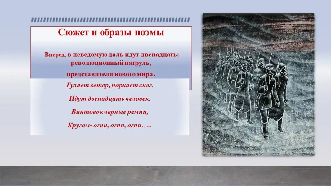 - Герои поэмы: образ двенадцати, движение патруля по улицам города как переход из старого мира в новый, изменения героев.