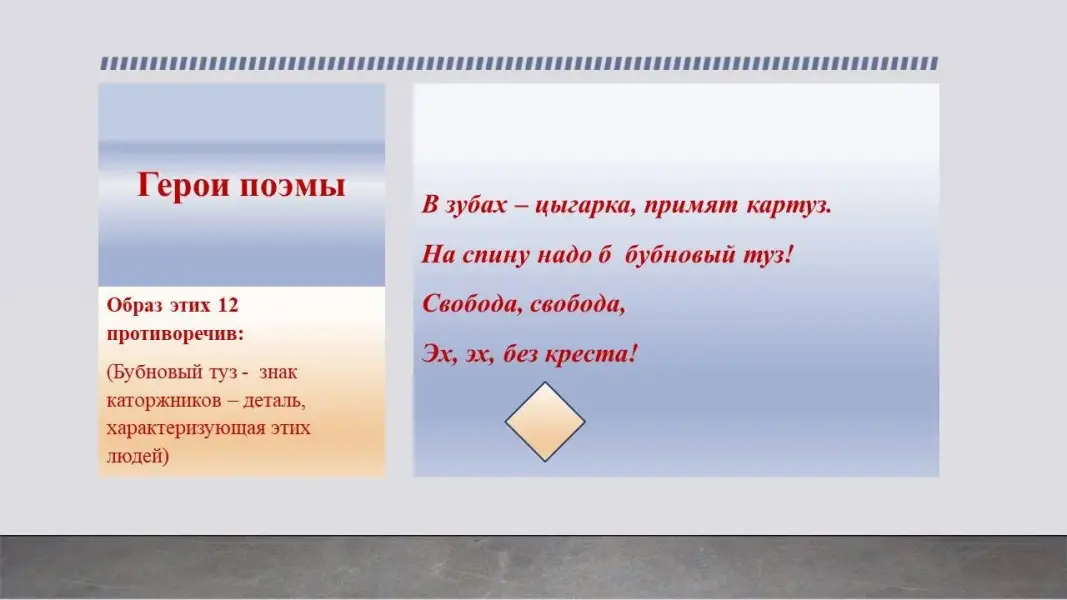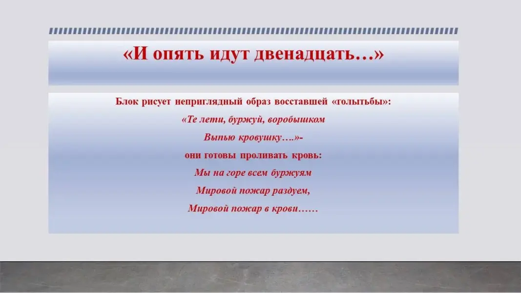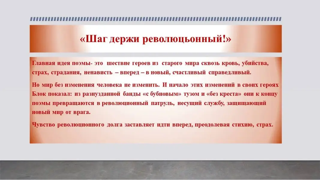 20 слайд. Основная идея поэмы - это шествие героев из одного мира в другой, сквозь кровь, убийства, страх, страдания, ненависть - вперед. Из старого мира - в новый, счастливый справедливый. Но мир без изменения человека не изменить. И начало этих изменений в своих героях Блок показал. Из разнузданной банды «с бубновым» тузом и «без креста» они к концу поэмы превращаются в революционный патруль, несущий службу, защищающий новый мир от врага.