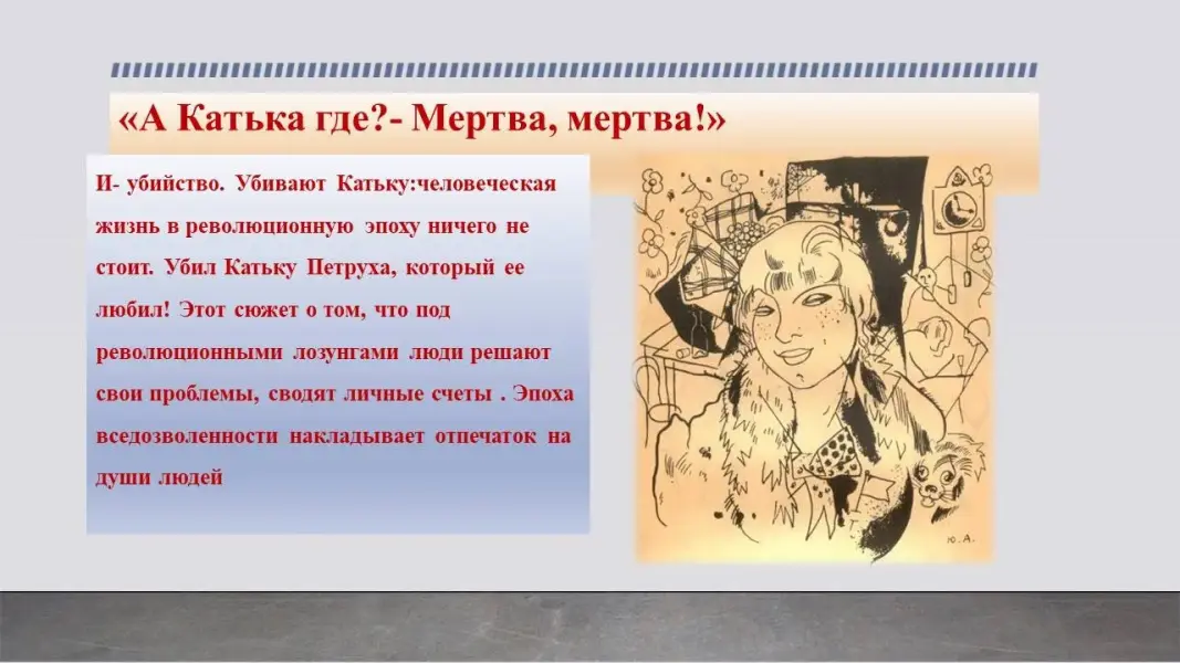 15 слайд. И - убийство. Убивают Катьку - человеческая жизнь в революционную эпоху ничего не стоит. Убил Катьку Петруха, который ее любил. Этот сюжет о том, что под революционными лозунгами люди решают свои проблемы, сводят личные счеты. Эпоха вседозволенности накладывает отпечаток на души людей.