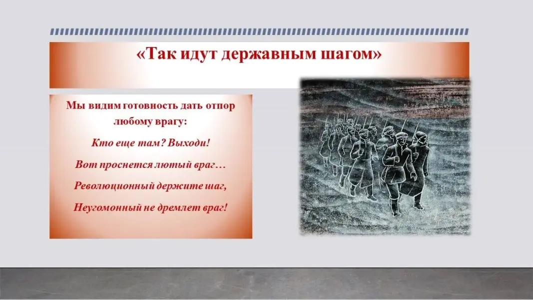 21 слайд. Чувство революционного долга заставляет идти вперед, преодолевая стихию, страх. Мы видим готовность дать отпор любому врагу: