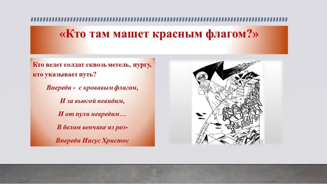 24 слайд. Образ Христа оказался неожиданным для самого поэта. «Страшная мысль этих дней: не в том, что красногвардейцы не достойны Иисуса, который идет с ними сейчас, а в том, что именно Он идет с ними, а надо, чтобы шел Другой».