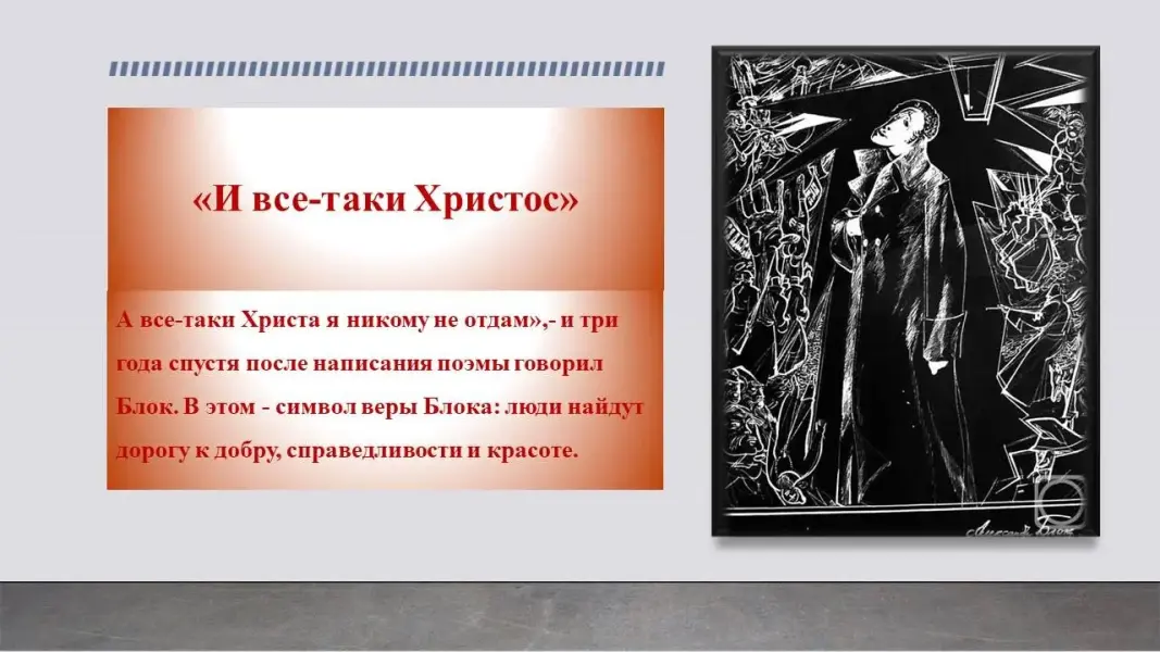 25 слайд. И все-таки Иисус Христос! Он выведет Россию в светлое будущее.В этом - символ веры Блока. «А все-таки Христа я никому не отдам»,- и три года спустя после написания поэмы говорил Блок. В поэме образ Христа дан как высокий нравственный идеал, к которому надо стремиться. Поэт верил, что люди найдут дорогу к добру и красоте.