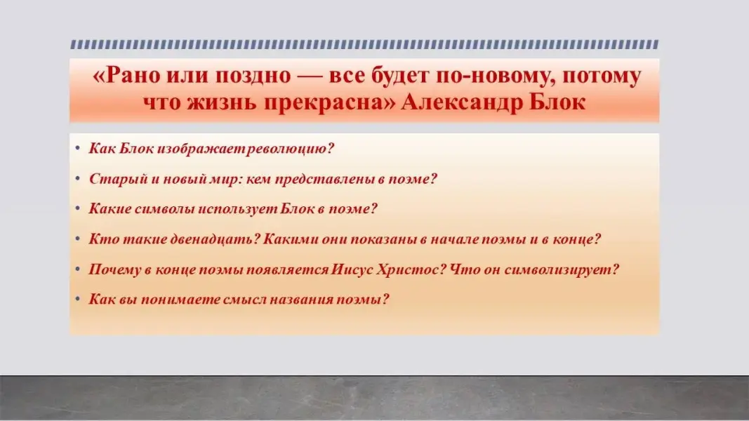 Цель урока: прочитать поэму «Двенадцать», понять основную идею, выявить особенности в изображении Блоком революции, рассмотреть образы и символы, используемые поэтом для раскрытия замысла.