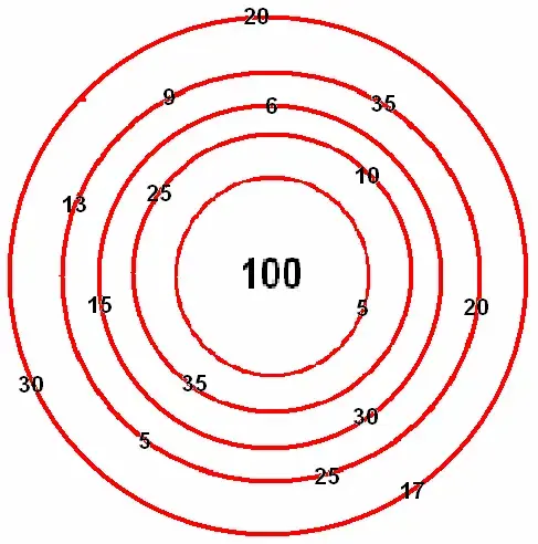 Ведущий: Да это целый лабиринт, нужно пройти через 5 ворот, которые обозначены числами (в каждой окружности можно проходить только через одни ворота) и дойти до центра лабиринта. Надо выбирать такой путь, чтобы сумма чисел до центра составила 100.