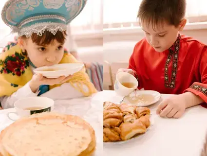 Учитель: А вот Богдан любит чай пить вприглядкуу. Давайте нальём чай в блюдца и вместе с Богданом выпьем вприглядку.