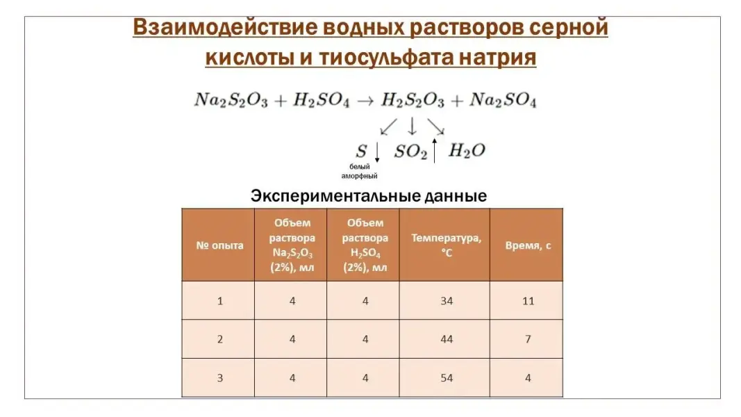 При изучении курса общей химии по углубленной программе 11 класса в рамках темы «Химическая кинетика» обсуждается вопрос влияния температуры на скорость химической реакции. Поскольку объектом изучения химии являются вещества и их превращения, обучение должно быть построено на единстве теории и химического эксперимента - особого средства наглядности, которое позволяет подтвердить или опровергнуть теоретические выводы и прогнозы. Обсуждение вопроса влияния температуры на скорость химической реакции начинается с наблюдений за образованием осадка серы при взаимодействии водных растворов серной кислоты и тиосульфата натрия одинакового объема и одинаковой концентрации при разных температурах (∆t=10°). Уменьшение времени образования осадка по мере роста температуры указывает на факт возрастания скорости реакции, что согласуется с эмпирическим правилом Вант-Гоффа, а увеличение температурного коэффициента γ говорит о наблюдаемом ускорении химического взаимодействия.
