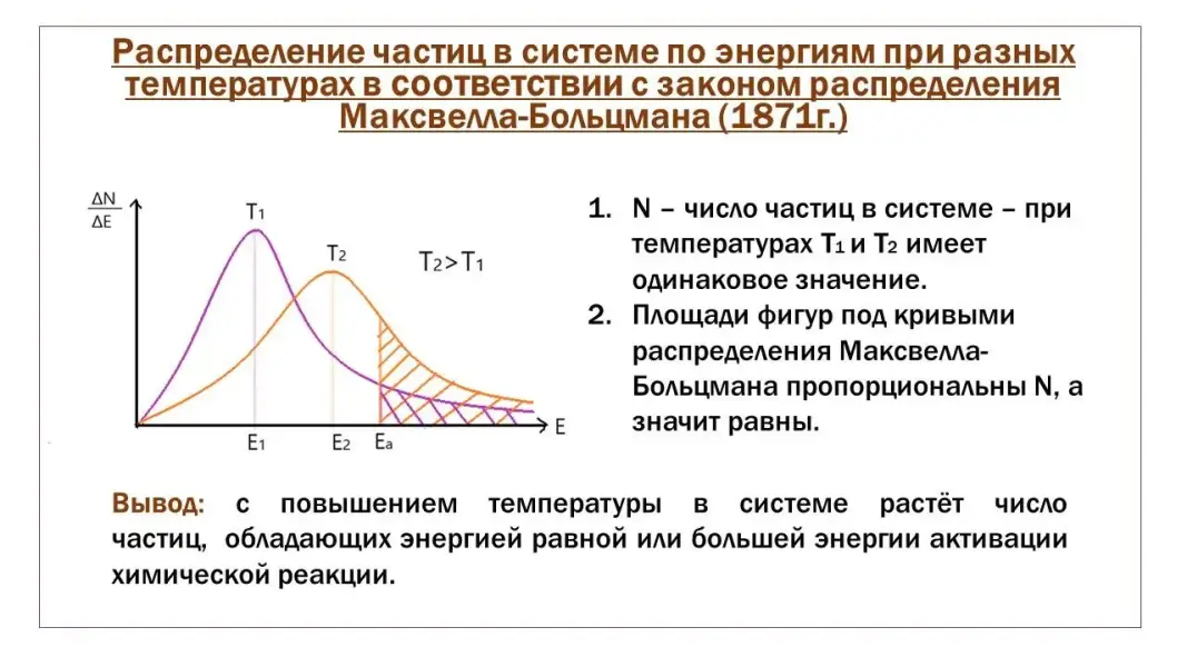 Путем логических умозаключений, сопоставляя кривые распределения молекул в системе по энергиям при разных температурах, на основе закона распределения Максвелла-Больцмана учащиеся приходят к выводу о том, что с ростом температуры в системе возрастает число так называемых активных частиц, чья энергия равна энергии активации реакции или превышает её. Это и является причиной возрастания с ростом температуры скорости любой химической реакции, независимо от её теплового эффекта.
