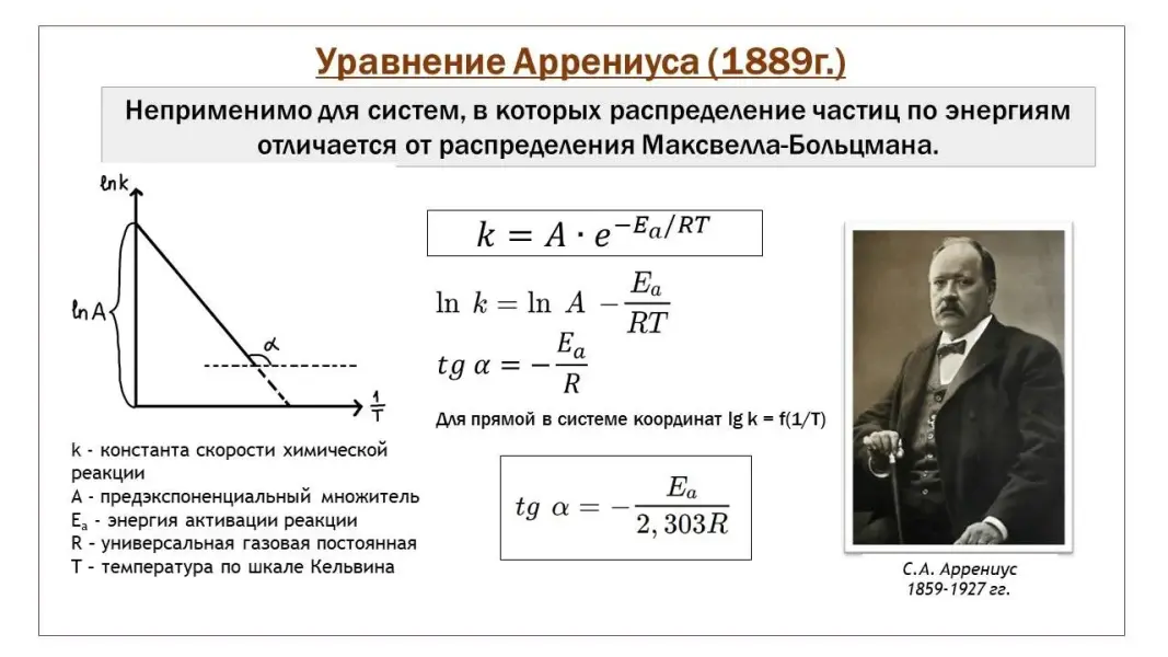 Число активных частиц в системе с ростом температуры возрастает по экспоненциальному закону, математическим выражением которого является уравнение Аррениуса (при этом следует отметить, что уравнение Аррениуса неприменимо для систем, в которых распределение частиц по энергиям отличается от распределения Максвелла-Больцмана). Логарифмируя это уравнение, учащиеся получают результат lnk = lnA-Ea/RT, в котором самостоятельно узнают уравнение прямой в координатах lnk = f(1/Т). Очевидно, что подобного рода умозаключение возможно лишь при условии прочно сформировавшихся навыков выполнения математических действий и математических знаний.