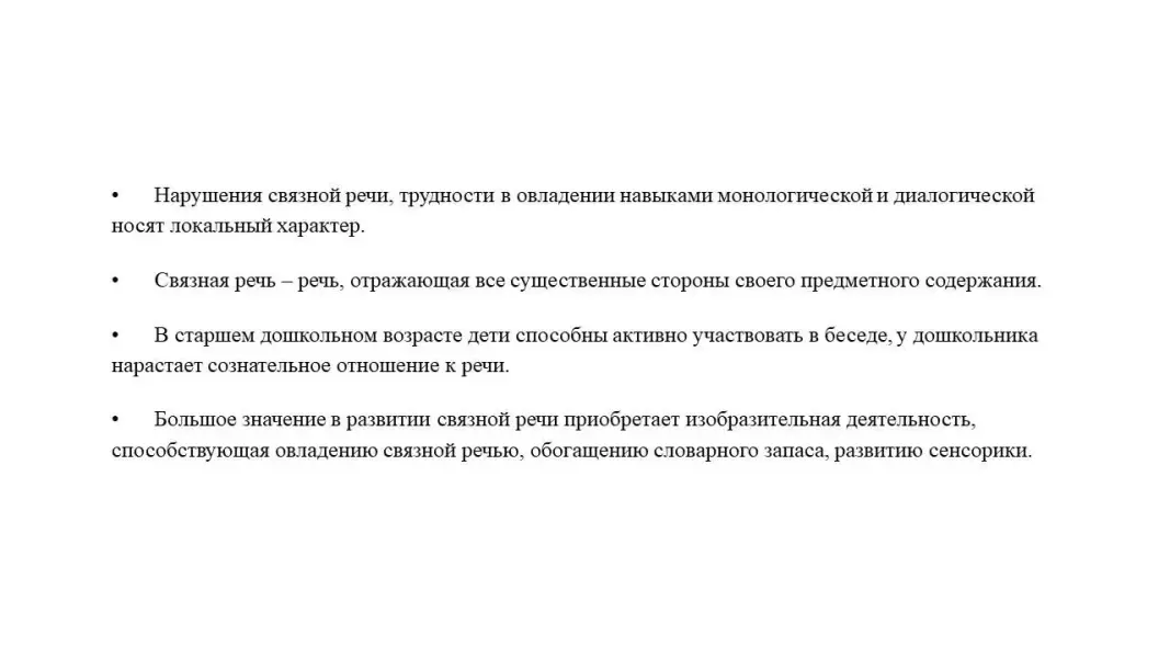 Нарушения связной речи, трудности в овладении навыками монологической и диалогической могут носить локальный характер (без сочетания с другими нарушениями) или являться симптомом более сложного по структуре расстройства (интеллектуальной недостаточности, дефектов зрения и др.). Некоторые трудности дошкольников могут быть преодолены непосредственно педагогами ДОУ, но значительная часть нарушений связной речи носит специфический и стойкий характер; для их коррекции необходима логопедическая помощь.