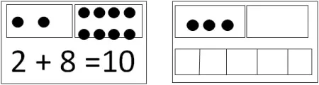 Два прямоугольника - это вагоны трамвая. На одном прямоугольнике нарисованы кружочки - это зайчики. Дорисуйте во втором прямоугольнике столько кружочков, чтобы всего их стало 10. Внизу запишите пример.