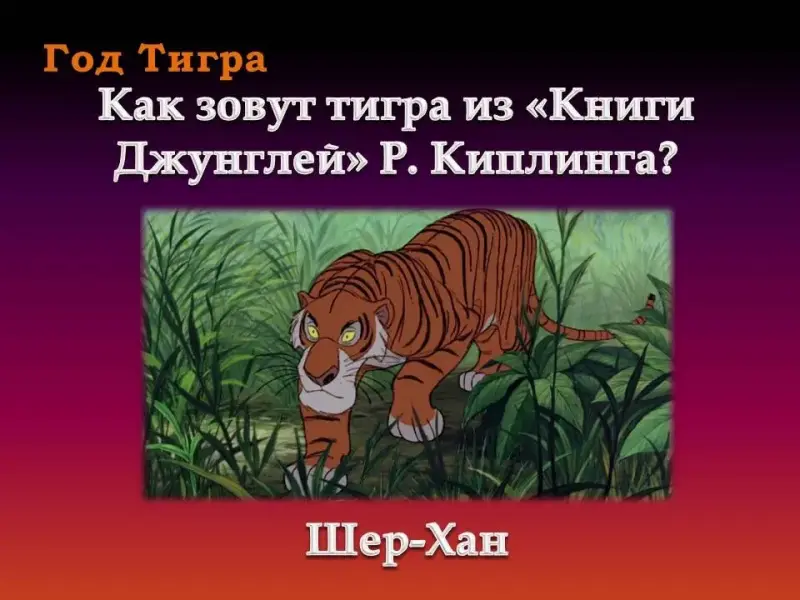 - Как зовут тигра из «Книги джунглей»? (Шер-Хан)