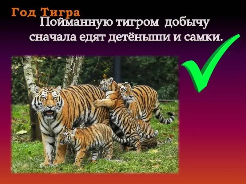 - Пойманную тигром добычу сначала едят самка и детёныши. (Это так. Этим тигра отличаются от львов: лев сначала ест сам, а детенышам остается то, что не доел лев).
