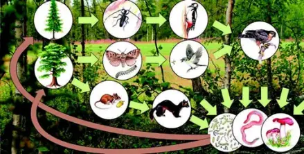 Задание 1. Рассмотри рисунок, где представлены обитатели экосистемы леса. Вспомни, что обозначают стрелки. Назови цепи питания, изображённые на рисунке.