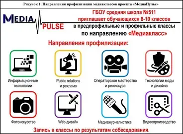 Проект должен обеспечить раннюю профилизацию учеников 8-11 класса четырех ближайших школ района, в котором проживает более 75 тысяч жителей. В ходе реализации проекта будут открыты медиаклассы сменного состава по направлению медиажурналистика, фотоискусство, информационные технологии, Public relations и реклама, web-дизайн, операторское мастерство и режиссура, видеопроизводство, технологии моды и дизайна (рисунок 1). Широкий спектр направлений даст возможности развиваться учащимся в качестве специалистов в коммуникациях, журналистике, блогерстве, маркетинге, проектном менеджменте, аудио-, фото- и видеопроизводстве. Отличительная черта проекта - возможность стажировок школьников в медиакомпаниях и СМИ, а также практических занятий на базе вузов-партнеров, чтобы лучше познакомиться со спецификой будущей профессии.