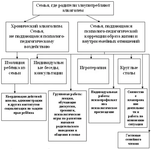 Работа с семьей проводится поэтапно. Ее эффективность зависит от степени установления контакта и доверительных отношений с родителями. Разделение семей по причинам неблагополучия относительно, так как одна причина неразрывно связана с другой. Например, в семье, где злоупотребляют алкоголем, почти всегда наблюдаются конфликтные отношения между родителями и детьми, кроме того, такие семьи, как правило, имеют нестабильное финансовое положение, являются малообеспеченными.