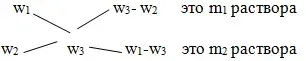 получаем отношение долей и масс исходных растворов в полученном растворе. Доля первого раствора в смеси это w3 - w2, а второго w1 - w3. Отсюда в нашей