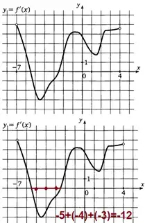 На рисунке изображен график производной функции f(x), определенной на интервале (- 7; 4). Найдите промежутки убывания функция f(x) . В ответе укажите сумму целых точек, входящих в эти промежутки. |