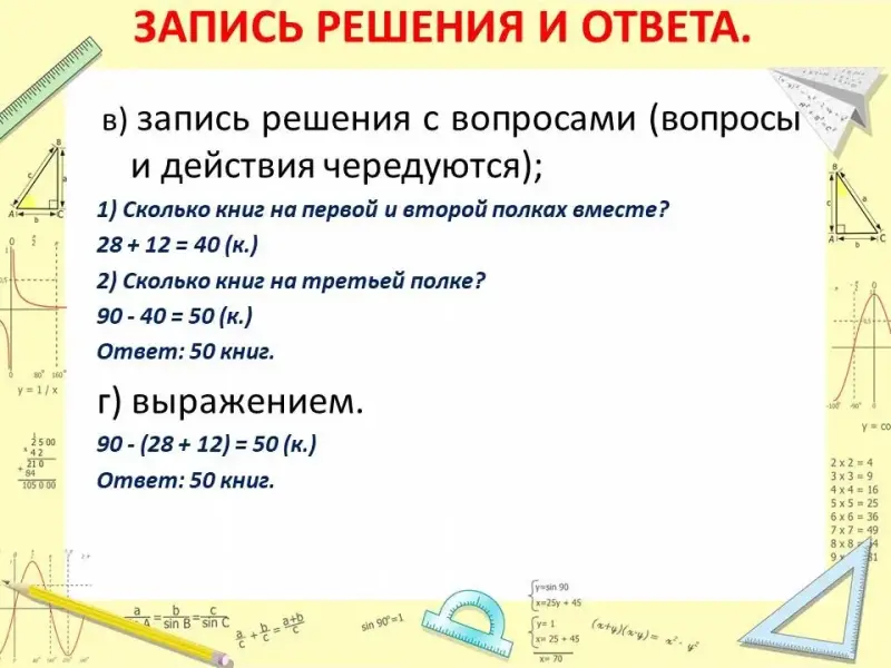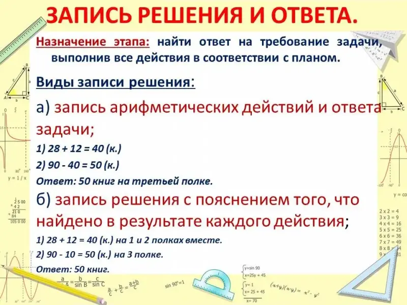 Формулировка ответа может быть краткой и полной. Правильность формулировки ответа ученик может проверить, подставив полученный ответ в предложение, содержащее вопрос задачи.