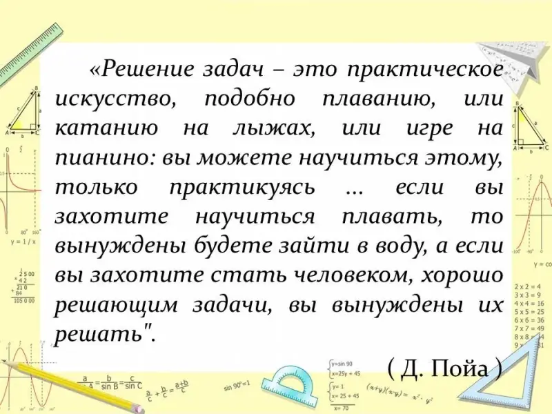 Математик и педагог Д.Пойа писал, "что решение задач - это практическое искусство, подобно плаванию, или катанию на лыжах, или игре на пианино: вы можете научиться этому, только практикуясь ... если вы захотите научиться плавать, то вынуждены будете зайти в воду, а если вы захотите стать человеком, хорошо решающим задачи, вы вынуждены их решать". Важно, чтобы задача обязательно решалась на каждом уроке и была бы ещё и одним из домашних заданий, т.е. «понемногу, но каждый день».