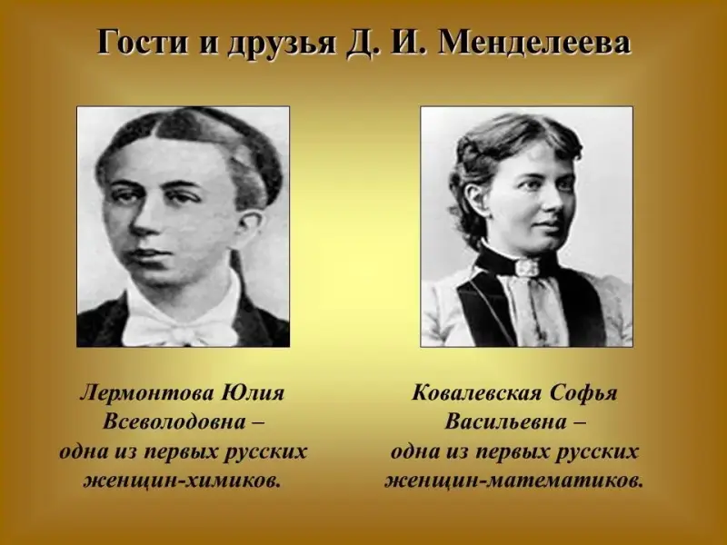 Постепенно круг участников расширялся. Здесь чествовали первых русских женщин-ученых - С.В.Ковалевскую, Ю.В.Лермонтову и других. Менделеев был деятельным сторонником женского образования в России. Слайд 5.