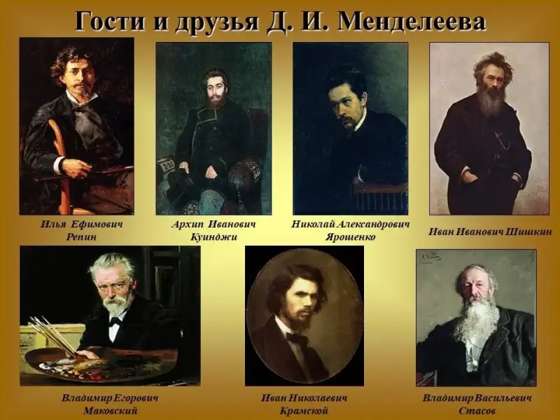 В квартире Менделеева устраивались также художественные «среды», на которых бывали И.Е.Репин, В.В.Стасов, А.И.Куинджи, Н.А.Ярошенко, И.Н.Крамской, В.Е.Маковский, И.И.Шишкин. Слайд 6.
