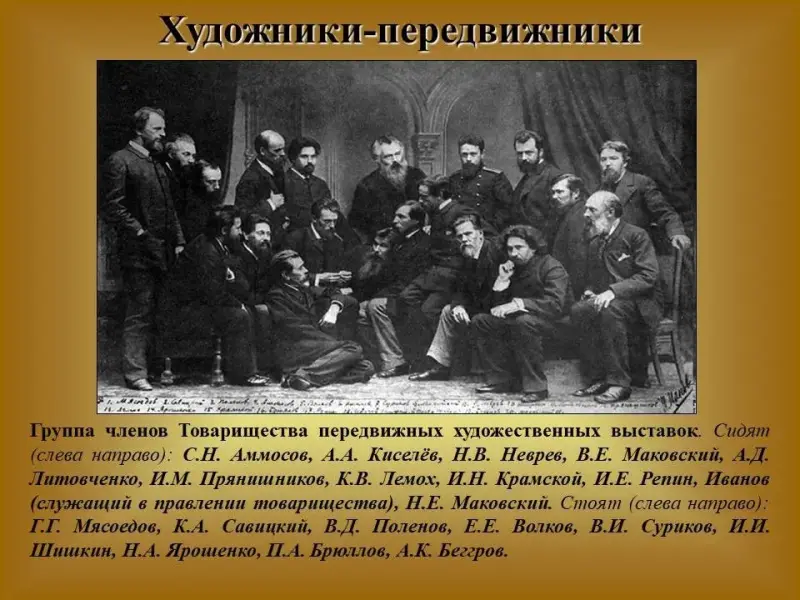 Встречи художников-передвижников были встречами единомышленников. И художники, и Менделеев ясно сознавали, что гуманистические, прогрессивные цели искусства и науки, в конечном счете, едины. Слайд 7.