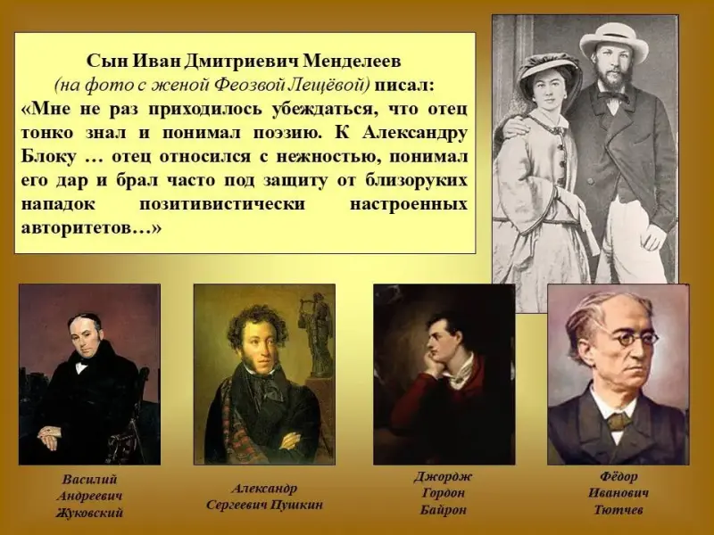 Ученик. Менделеев любил читать В.А.Жуковского и А.С.Пушкина, но больше всего ценил Байрона и Ф.И.Тютчева. Слайд 8. Сын Иван Дмитриевич, оставивший содержательные воспоминания об отце, писал: «Мне не раз приходилось убеждаться, что отец тонко знал и понимал поэзию». К Александру Блоку «…отец относился с нежностью, понимал его дар и брал часто под защиту от близоруких нападок позитивистически настроенных авторитетов…»
