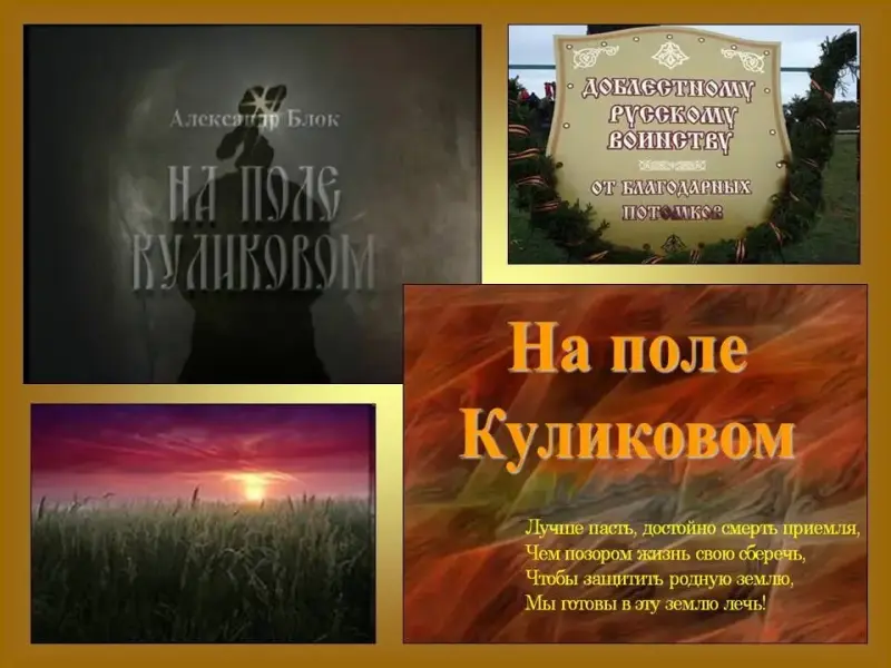 Ученик. Слайд 10. «На поле Куликовом» - цикл в цикле «Родина», главная тема которого - Россия. В нем он раскрыл один из самых трагических и драматических периодов в истории России. Поэт видит весь исторический путь страны - от «поля Куликова» до современных ему событий. Лирический герой - и древний русич-воин, и современник поэта. Единство времени, пространства, переживаний передано рядом символов, вписанных в динамичный пейзаж, полный тревоги, энергии и внутренней силы:
