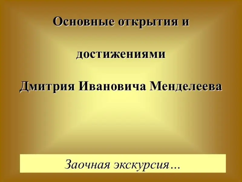 Хозяйка. А сейчас я вам предлагаю отправиться в заочную экскурсию, которая познакомит всех присутствующих с основными открытиями и достижениями Д.И.Менделеева. Слайд 12.