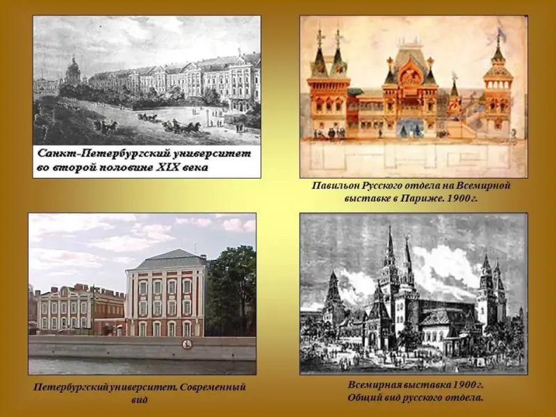 1) Перед вами Петербургский университет, где с 1865 по 1890 гг. трудился профессор. А это павильон Российской империи на Всемирной выставке в Париже, где Менделеев отвечал за организацию промышленной части российской экспозиции и был избран в жюри выставки. Слайд 13.