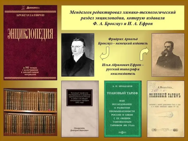 4) Менделеев редактировал химико-технологический раздел энциклопедии, которую издавали Ф.А.Брокгауз и И.А.Ефрон, искал пути защиты отечественной промышленности от конкуренции западных монополий и предложил их в книге «Толковый тариф». Слайд 16.
