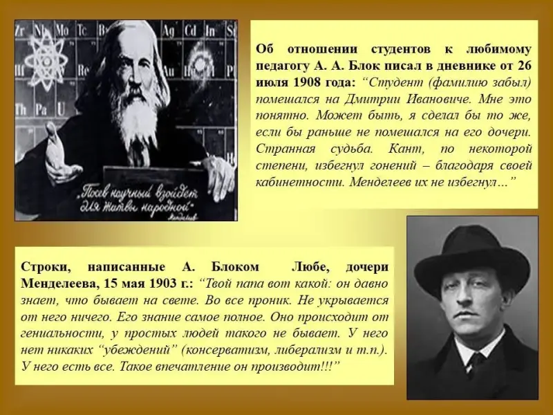 Ученик. Слайд 20. Пожалуй, Блоку удалось уловить то главное, сокровенное, что составляло некую глубинную сущность необычной личности Дмитрия Ивановича. Вдумаемся в строки, написанные Любе, дочери Менделеева, 15 мая 1903 г.: «Твой папа вот какой: он давно знает, что бывает на свете. Во все проник. Не укрывается от него ничего. Его знание самое полное. Оно происходит от гениальности, у простых людей такого не бывает. У него нет никаких «убеждений» (консерватизм, либерализм и т.п.). У него есть все. Такое впечатление он производит!!!»