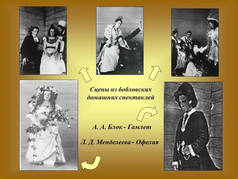 Ученик. 1898 год. Александр вспомнил, что весной, на государственной выставке Сатура, Анна Ивановна Менделеева приглашала его бывать у них, в Боблово, запросто, по соседству. И он стал там бывать регулярно. В Боблово часто устраивались любительские спектакли. Люба и Александр принимали в них активное участие. И вот они встречаются. Они играют в одном спектакле домашнего театра. Блок - Гамлет, Менделеева - Офелия. Слайд 25.