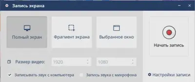 Если выбрать первый вариант, на мониторе появится дополнительная панель настроек, позволяющая ограничить зону съемки (полный экран, фрагмент или только выбранное окно), установить размер видео, запись звуков ПК и микрофона. Когда все будет готово, нажмите «Начать запись», после чего начнется 5-секундный отсчет.
