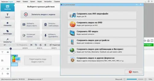 Когда ролик будет готов к публикации, сохраните его, нажав на зеленую кнопку «Сохранить видео». После этого программа предложит несколько форматов: