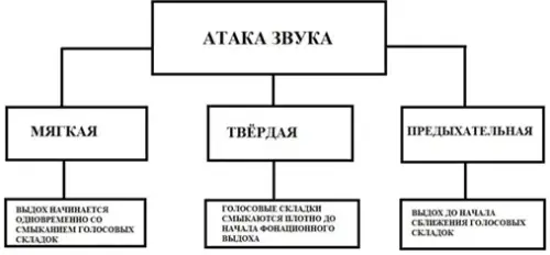 В одной из своих методических работ Н.В.Липкань и Т.И.Позднякова пишут о том, что атака звука является началом фонации, когда дыхание и голосовые складки приводятся во взаимодействие. Различают три основных вида атаки: мягкая, твёрдая и придыхательная, см. Рис. 1.