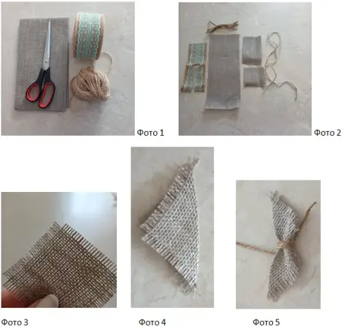 5. Свернуть квадрат по диагонали пополам, собрать в гармошку посередине, перевя-зать шпагатом 15 см, завязать узлы. (получились уши) (фото 4 и 5). Отложить в сторону.