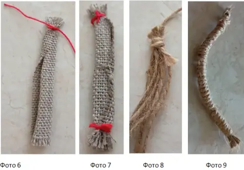 6. Теперь смотаем передние ножки. Возьмем прямоугольник 6Х10см, с коротких сторон вытащить по 2 нитки. Скрутить вдоль длинной стороны в трубочку. Перевязать с двух сторон красной ниткой. Завязать узлы. Получились ножки с копытцами. (фот 6, 7)