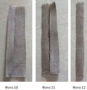 10. И еще раз нужно свернуть ткань по длинной стороне пополам, спрятав кромки внутрь. Получился прямоугольник 2,5x25 см (фото 12)