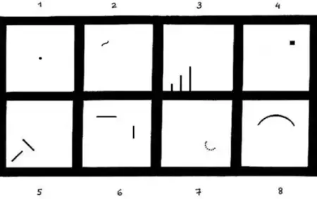 Бланк теста Вартегга представляет собой лист формата А4, разделенный на два ряда по четыре квадратных поля для рисования в каждом. Размер поля 4x4 см, причем белые квадраты рабочего поля резко выделяются на темном фоне. В каждом из квадратов - по одну стимулу. С количественной точки зрения они весьма скупы, но качественно очень точны. Их переработка испытуемым и наполнение их содержательными ассоциациями, закономерно выявляет частые смысловые мотивы.